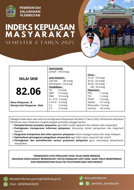 Berdasarkan hasil pengolahan Survei Kepuasan Masyarakat, diperoleh nilai IKM sebesar 82,06, yang berada pada kategori B (Baik). Capaian ini menunjukkan bahwa secara umum masyarakat menilai pelayanan publik yang diselenggarakan oleh Pemerintah Kalurahan Plembutan telah berjalan dengan baik dan sesuai dengan harapan.